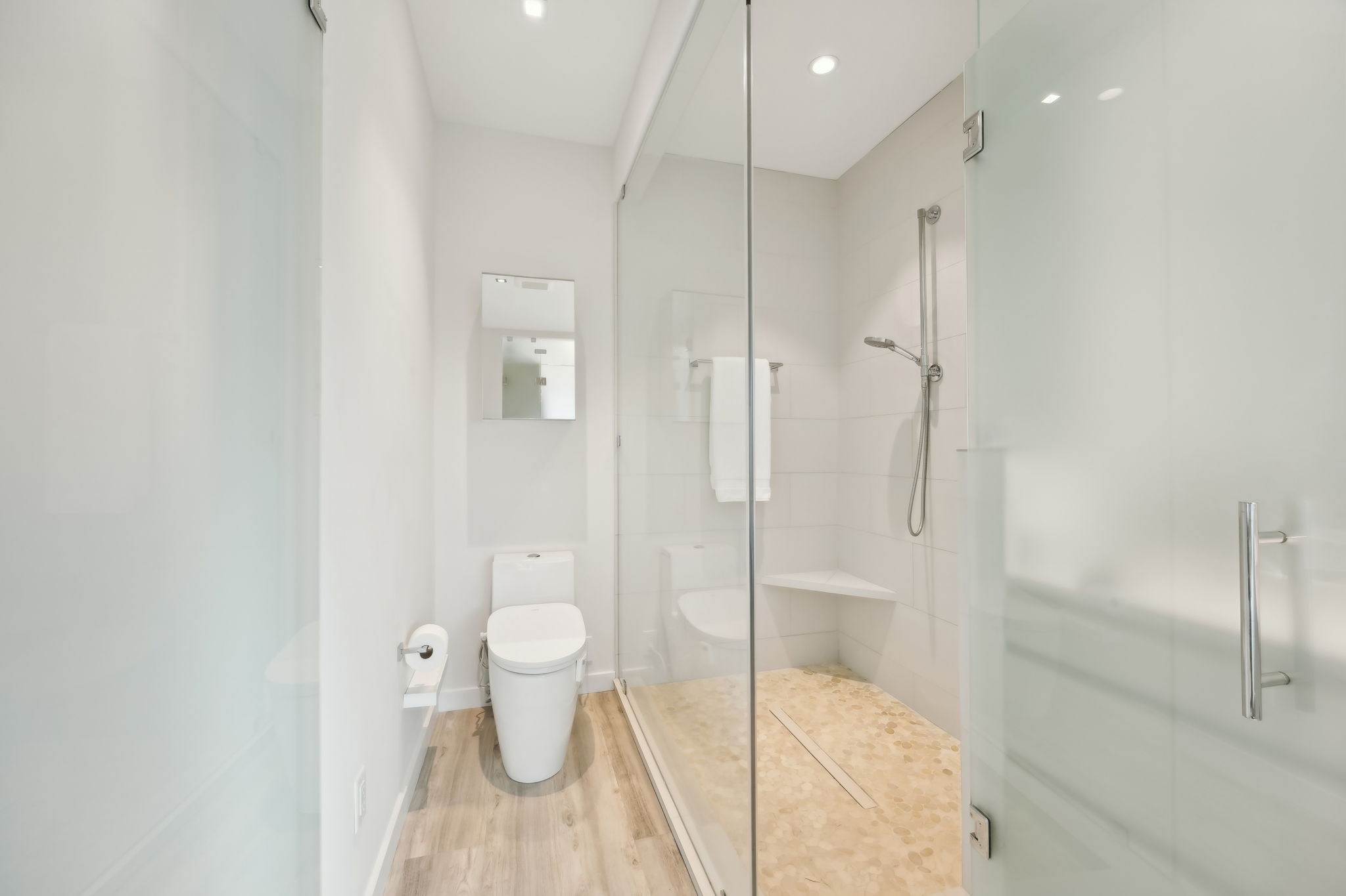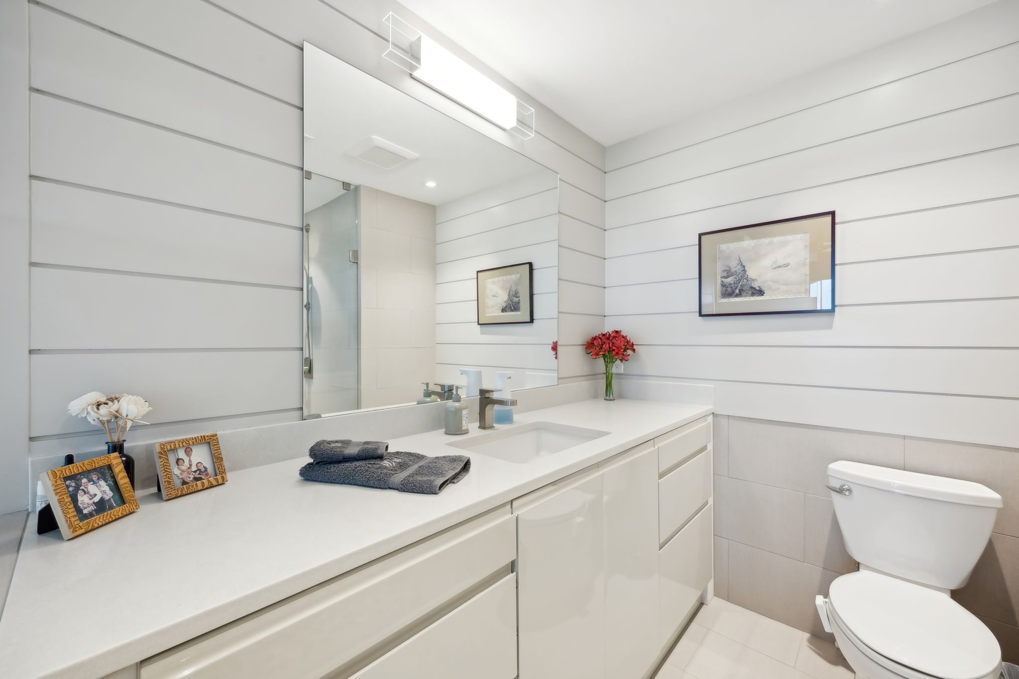 Custom woodworking and trim by a master New England craftsman from Vermont elevate the interiors, complemented by extensive built-in cabinetry and an exceptional amount of storage throughout both the living spaces and bedrooms. All four bedrooms are en suite, with two on the main level and two upstairs, offering flexibility, privacy, and comfort for full-time living or hosting guests. Every bathroom was fully rebuilt and, in many cases, thoughtfully re-aligned to improve flow and function.
