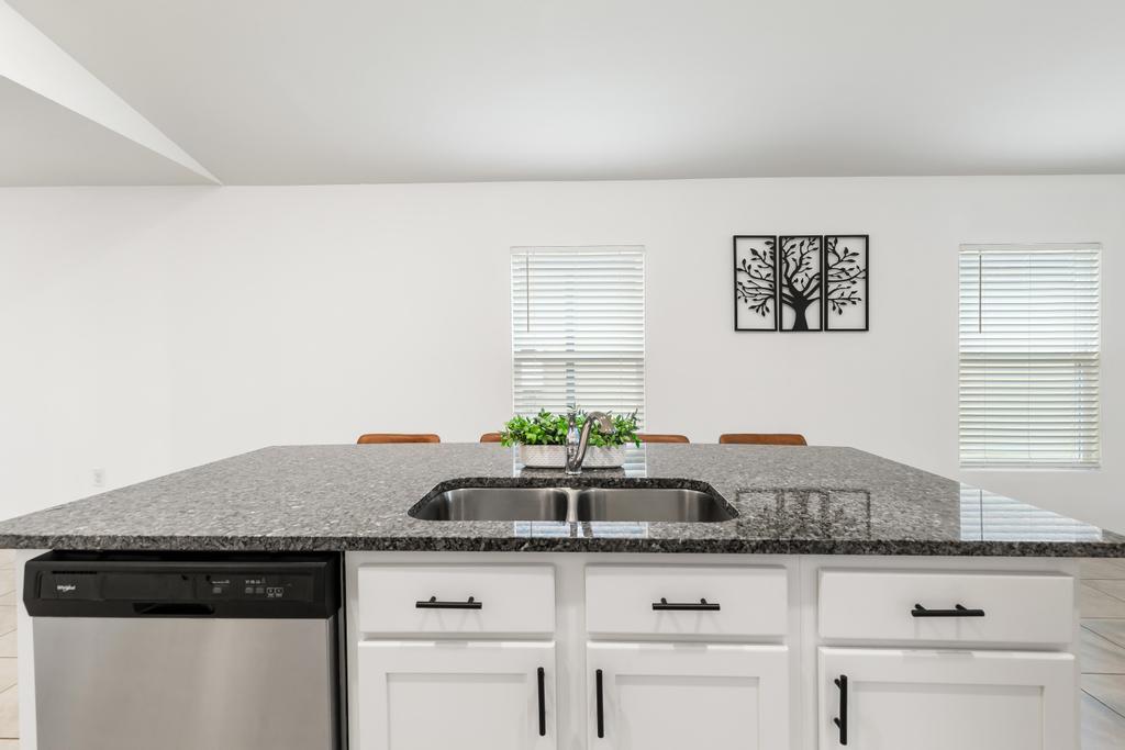 The kitchen is the heart of the home, showcasing granite countertops, 42-inch cabinetry, and a walk-in pantry, with plenty of room to cook, gather, and entertain. Tile flooring throughout the main living areas adds durability and a clean, contemporary look.